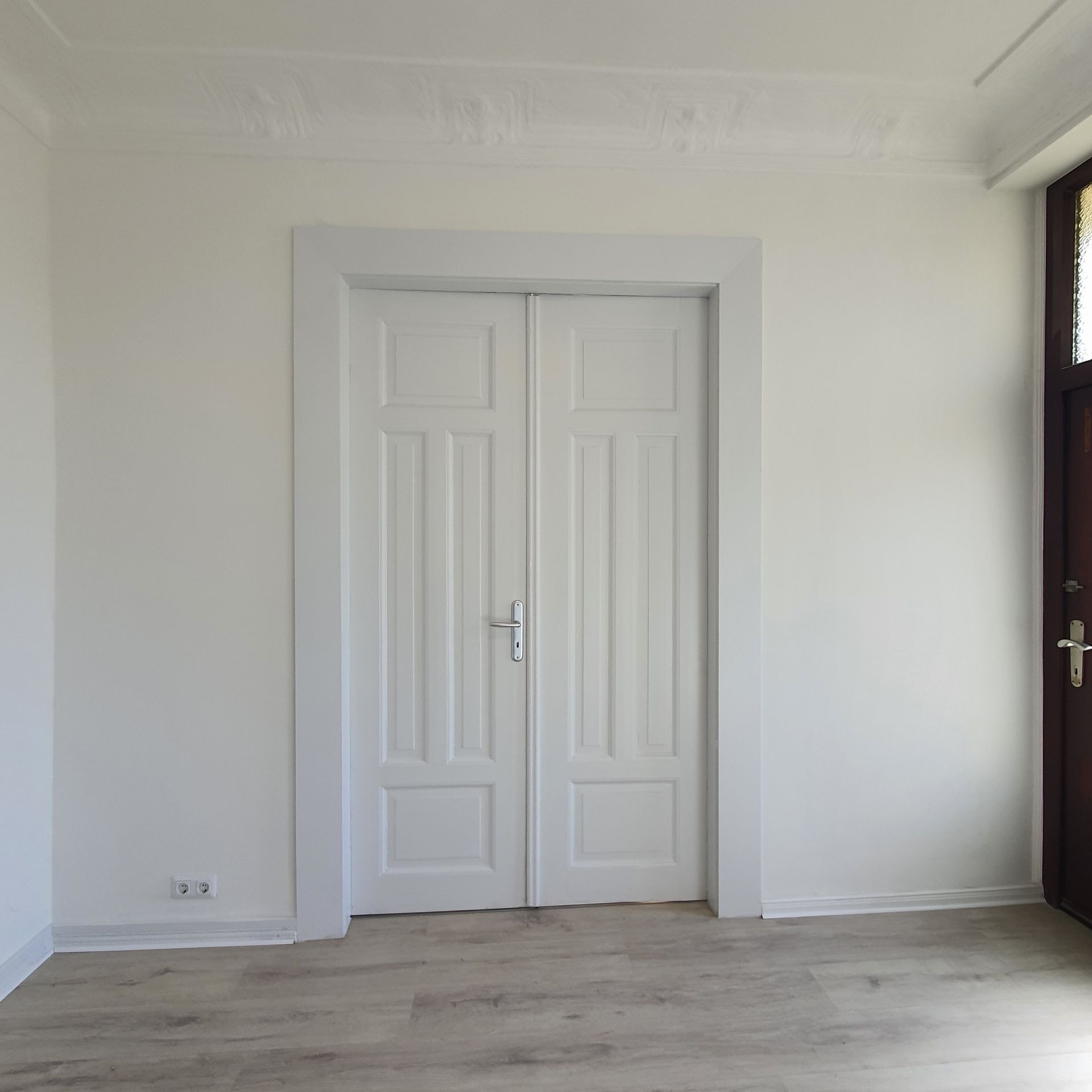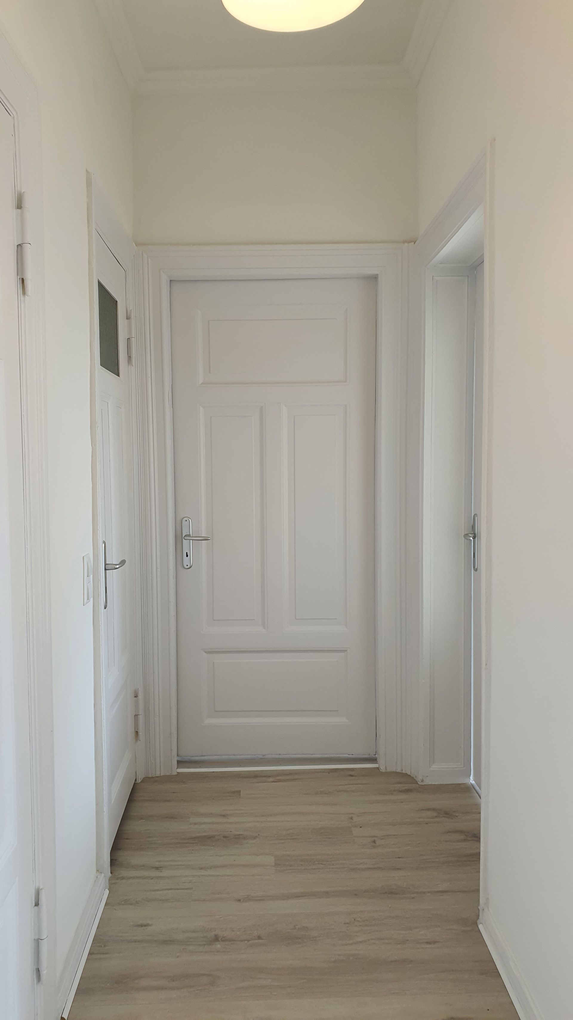 Die Räume haben hohe Decken und Stuck. Sie sind mit trendigem Laminat und moderner Beleuchtung ausgestattet.